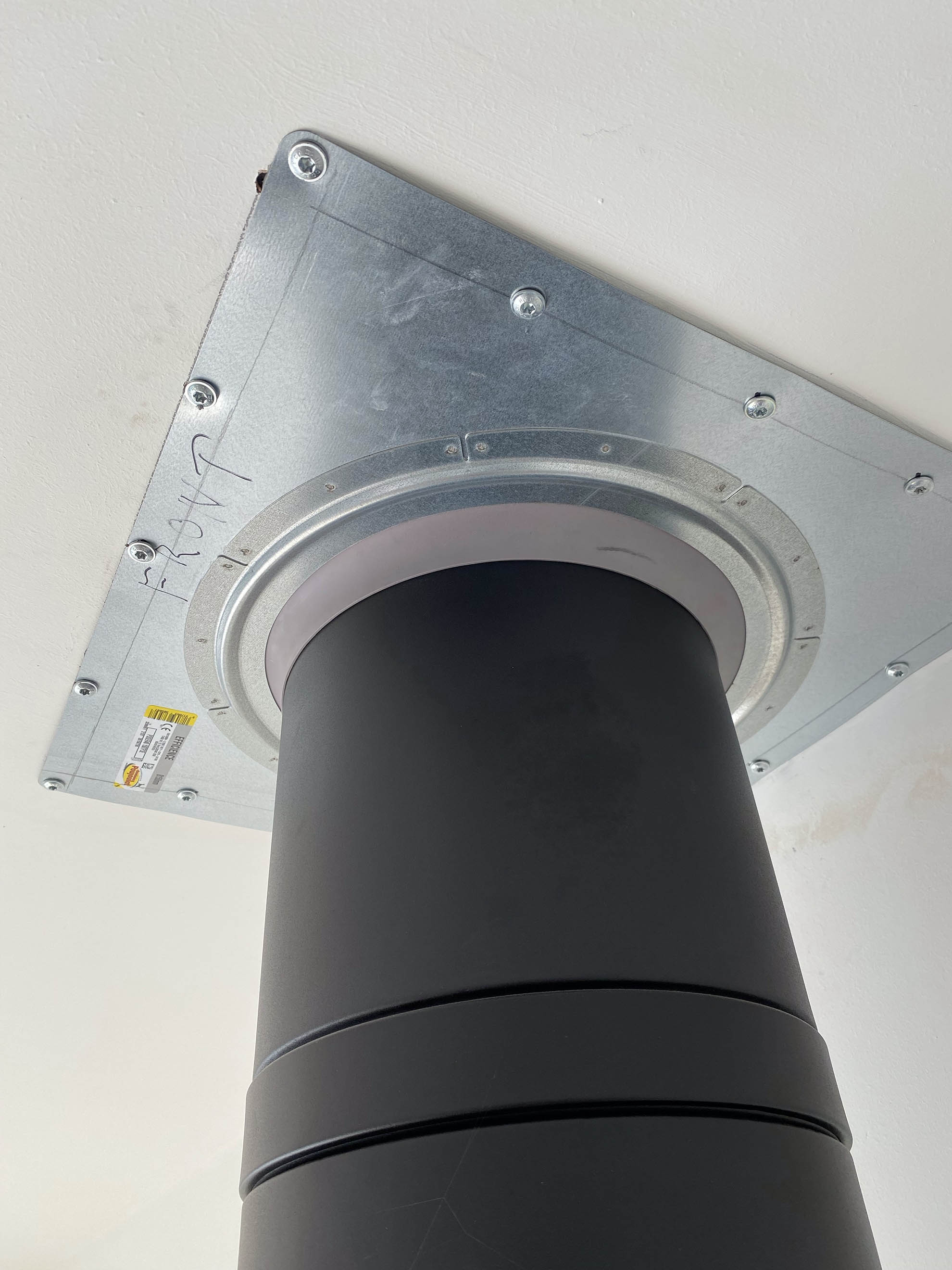 The manufacturers have created a steel plate with a flexible edpm rubber seal for the chimney to pass through to create a snug seal around the chimney system. The plate also has a rubber seal to the rear so can be sealed to the air tight membrane or ceiling / wall, alternatively it can be taped on the face using air tightness tape . They also come with a decorative wall plate.